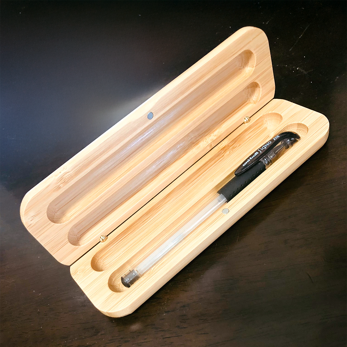 高級感もある丸みを帯びたフォルム、しっかりとしたヒンジで、エコな竹製ペンケースに「長崎の変」猫キャラ にゃーが5匹の図案をレーザー彫刻したものです