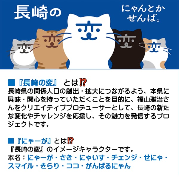 シンガーソングライターの福山雅治さんをクリエイティブプロデューサーとして、仲里依紗さん 長濱ねるさん 蛭子能収さん ??田明さん 前川清さん 役所広司さん EXILE TAKAHIROさん など長崎県出身の著名人の方々も 長崎の猫キャラの CV(キャラクター・ボイス)として広報ビデオに出演し応援されています。